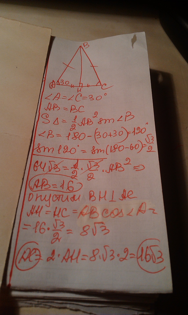 Площа рівнобедреного трикутника з кутом при основі 30° дорівнює 64 корінь з трьох см2. Знайдіть сторони трикутника.
