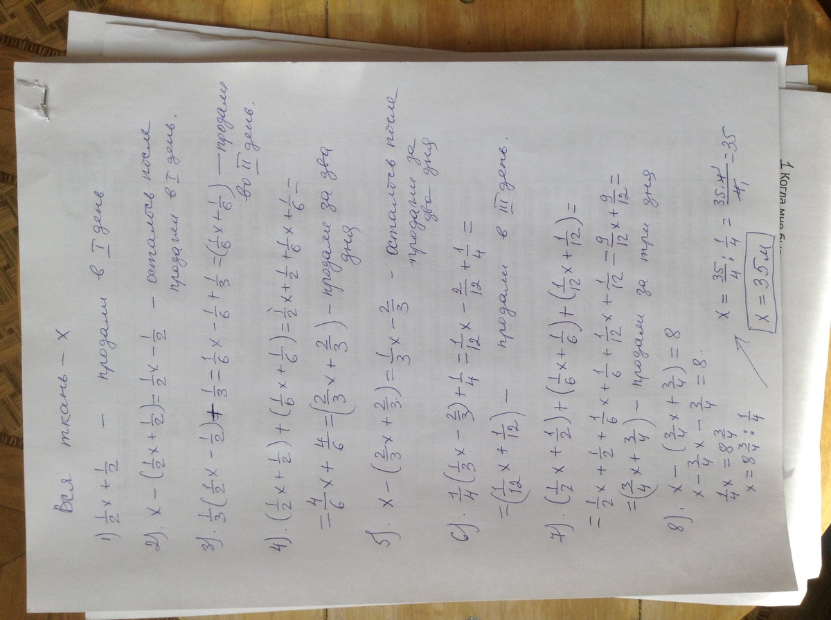 В первый день продали 1\2 всей ткани и 1\2 метров,Во второй 1\3 остатка и 1\3 метров,в третий день 1\4 нового остатка и 1\4 метров.После этого осталось 8 метров Сколько всего ткани продали за 3 дня?