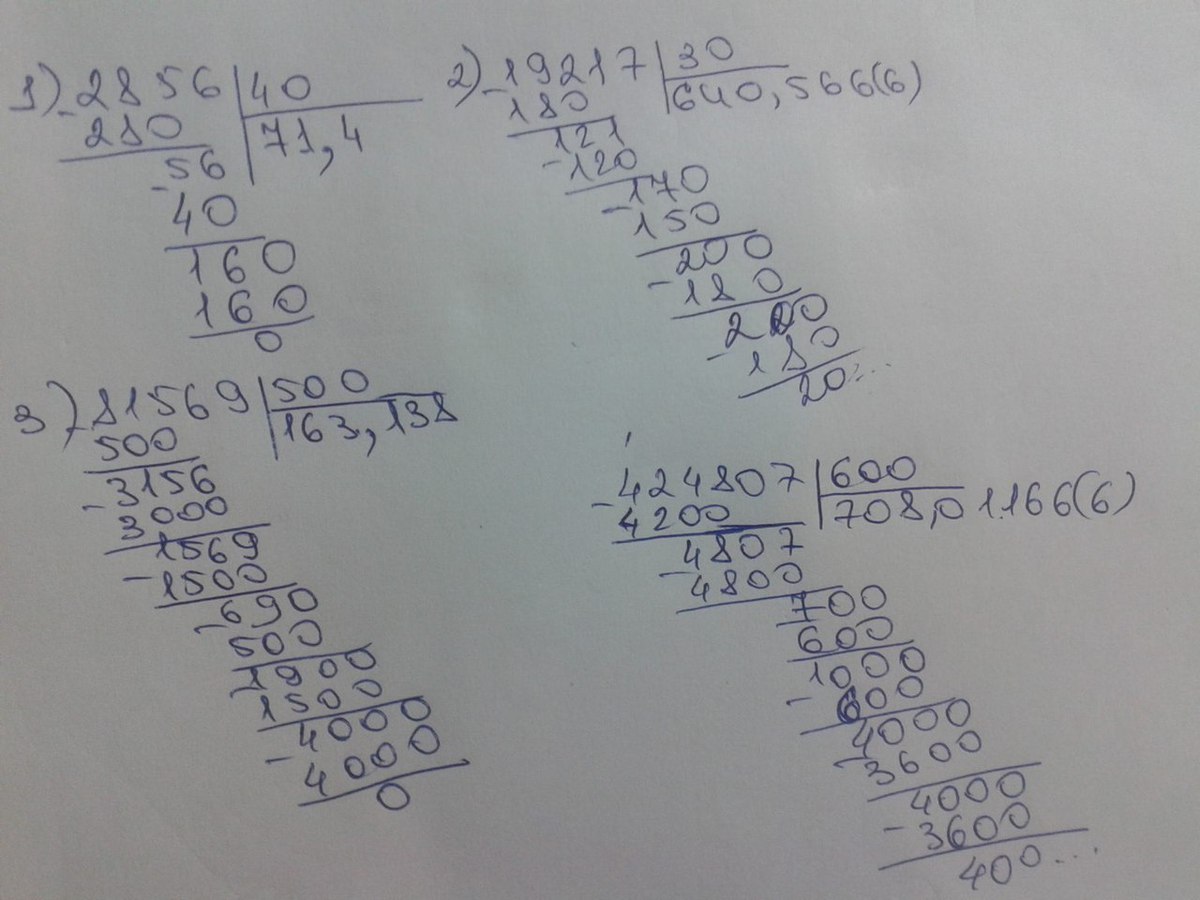 Решите в столбик пожалуйста эти примеры 2856:40, 19217:30, 81569:500, 424807:600 мне очень надо в столбик