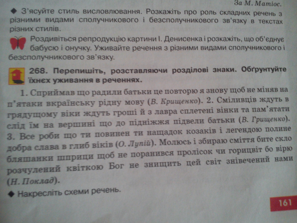 1. Сприймав, що радили батьки, це повторю я знову, щоб не міняв на п’ятаки вкраїнську рідну мову. 2. Сміливців ждуть в грядущому віки, ждуть гроші, й з лавра сплетені вінки, та пам’ятати слід їм на вершині,що до підніжжя підвели батьки. 3. Все роби, що ти повинен, ти - нащадок козаків, і легендою полине добра слава в глиб віків. 4. Молюсь і збираю сміття, бите скло, бляшанки, шприци, щоб не поранився пролісок чи горицвіт, бо вірю: розчулений квіткою, Бог не знищить цей світ, знівечений нами.
