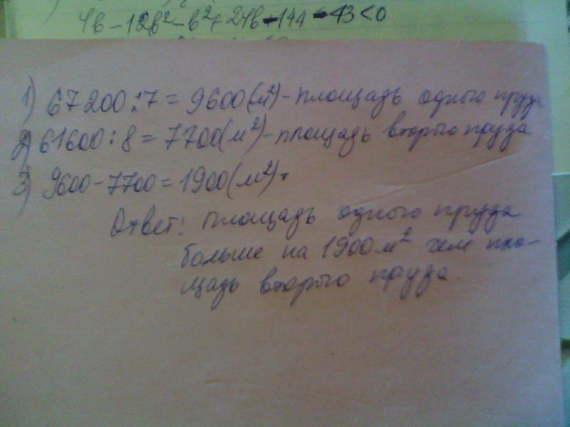 В рыбном хозяйстве в одном пруду вырастили по 7 кг карпа на 1 м квадрате площади пруда и получили 67 200 кг рыбы, а в другом пруду - по 8 кг карпа на 1 м квадрате площади и получили 61 600 кг рыбы . на сколько квадратных метров площадь одного пруда больше площади другого