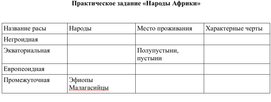 1. Негроидная раса: Народы - кенийцы, танзанийцы, сомалийцы, и др., Место проживания - полупустыни, саванны, тропические и экваториальные леса, Черты - удлиненные конечности, толстые губы, карие глаза, курчавые темные волосы, темная кожа
