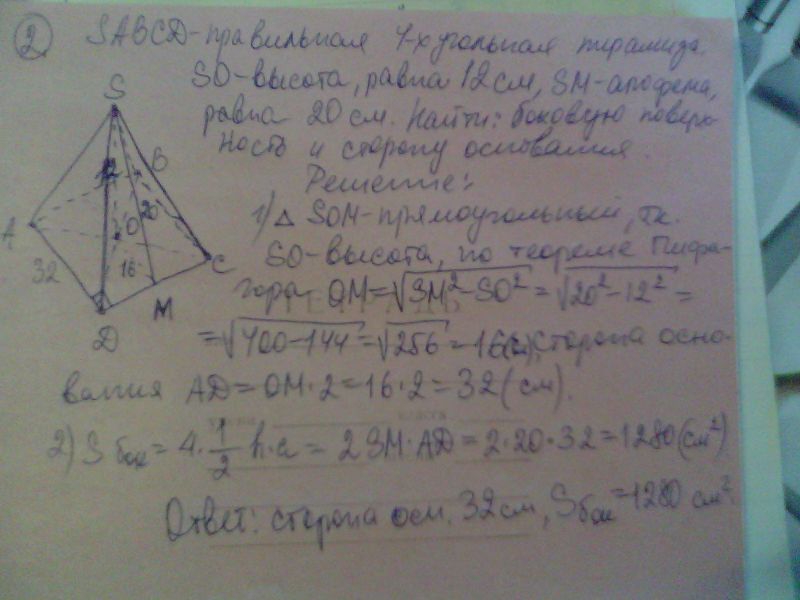 2.Высота правильной четырёхугольной пирамиды равна 12см, апофема равна 20см.