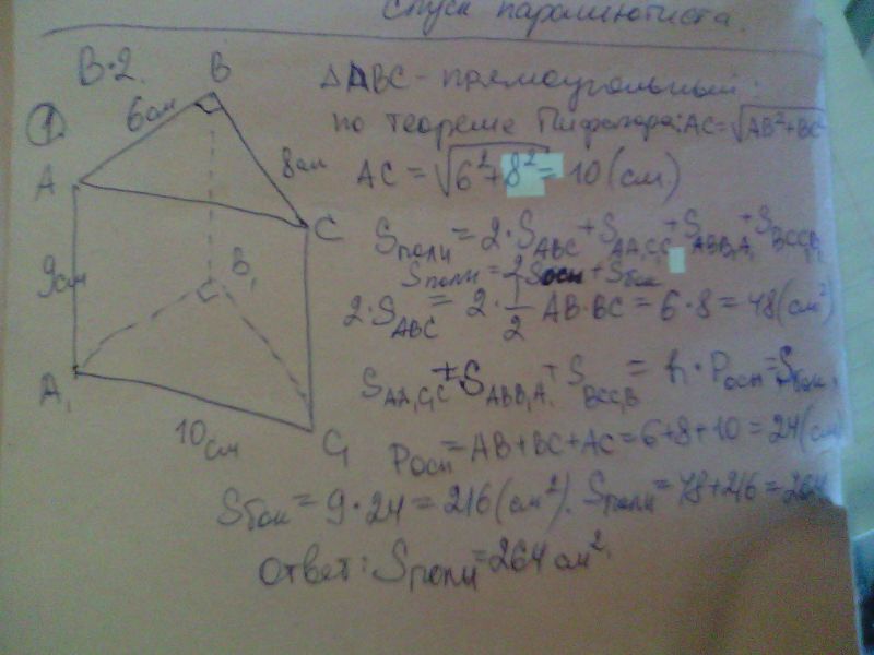 1. В основании треугольной призмы лежит прямоугольный треугольник с катетами 8см и 6 см.