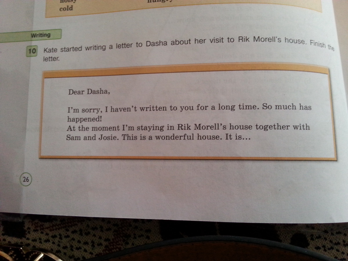 холодно письмо Кейт начал писать письмо к Даше о своей поездке в дом Rik Мореля. Завершите к письму. Уважаемый Даша, я извиняюсь, я не написал вам в течение длительного времени. Так много всего произошло! На данный момент я остаюсь в доме Rik Мореля вместе с Сэмом и Джози. Это замечательный дом. Это ...