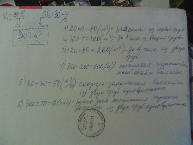 бассейн вмещает 300 метров кубических воды и наполняется двумя трубами через первую трубу вода вливается со скоростью 20 метров кубических в час а через вторую трубу со скоростью 30 метров кубических в час за сколько времени наполнится пустой бассейн при одновременном включении 2 3 сколько кубических метров воды выльется бассейн за 4 часа какой объем при этом остается незаполненным?