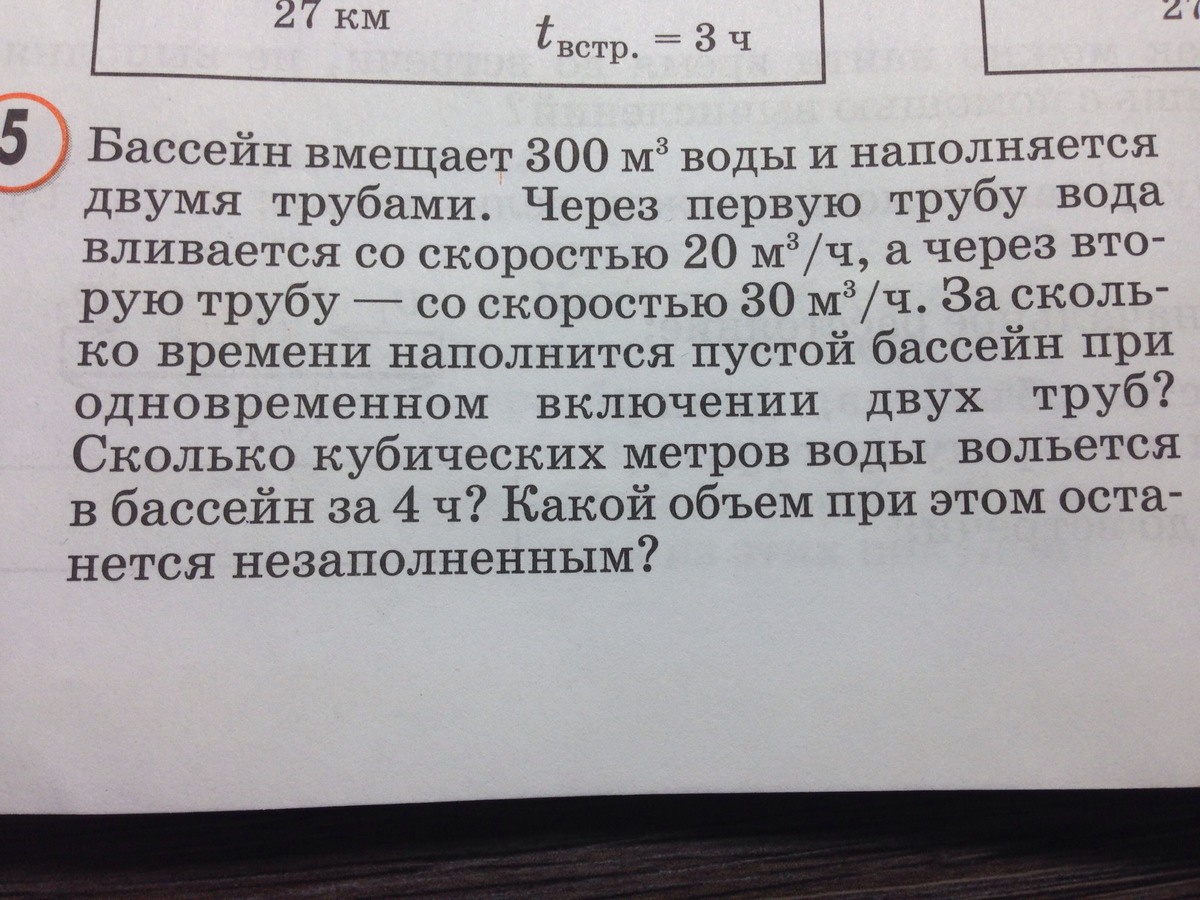 20+30=50 куб метров в час из 2 труб. 300:50=6 часов. 4*50=200 куб метров наполнится за 4 часа. 300-200=100 останется