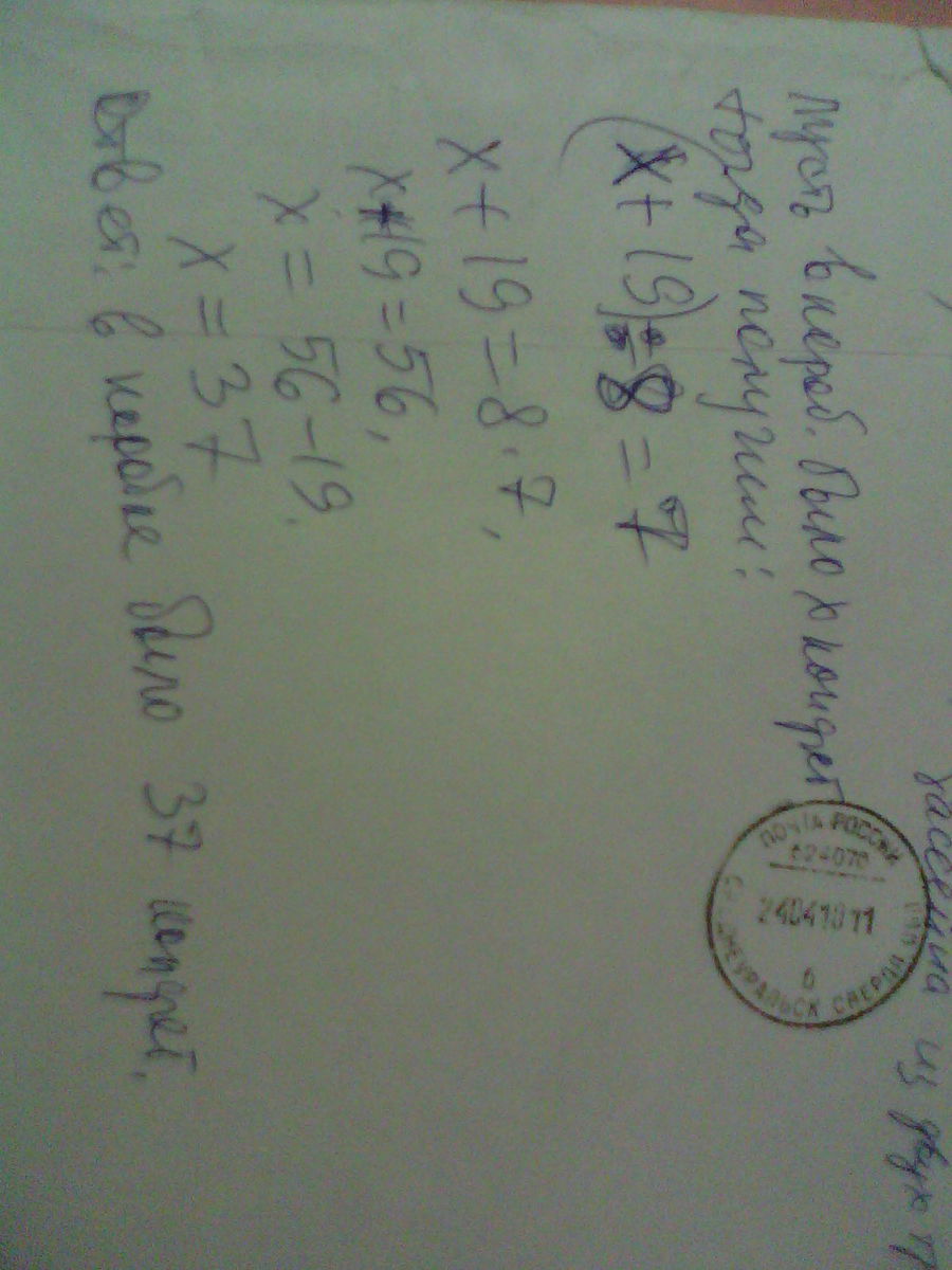 В коробке с конфетами добавили 19 конфет и разделили их поровну между 8 детьми . Каждый получил по 7 конфет . Сколько конфет было в коробке сначала ? (Решите задачу, составив уравнение )