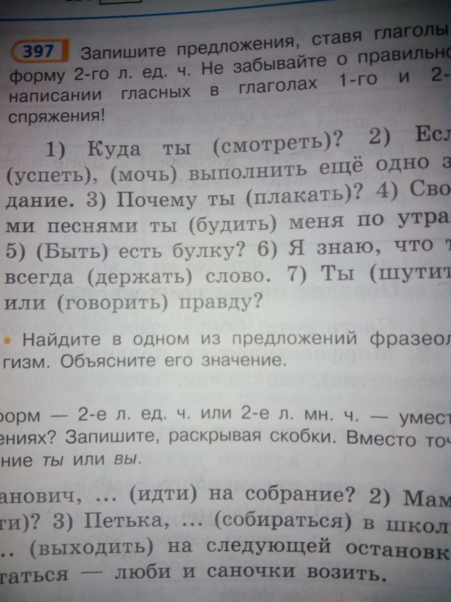 Куда ты смотришь? Если успеешь, можешь выполнить еще одно задание. Почему ты плачешь? Своими песнями ты будишь меня по утрам. Будешь есть булку? Я знаю, что ты всегда держишь слово. Ты шутишь или говоришь правду?