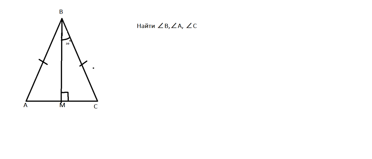 по условию AB = BC , значит треугольник равнобедренный, значит высота BM является и биссектрисой, т.е. угол CBM = углу ABM = 20