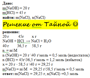 На нейтрализацию 20г раствора NaOH затрачено 45г раствора соляной кислоты. Рассчитайте массу и количество вещества полученной соли.