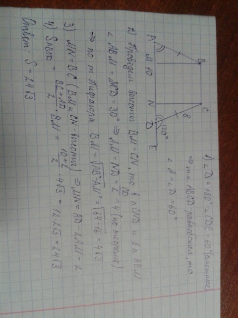 Найдите площадь равнобокой трапеции, большее основание которой равно 10 см, боковая сторона - 8 см, а тупой угол равен 120 градусов.