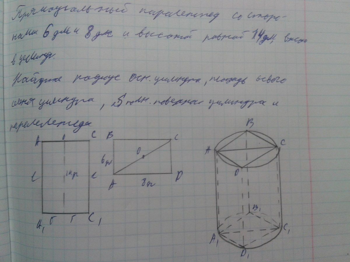 Прямоугольный паралелепипед со сторонами 6 дм. и 8 дм и высотой равной 14 дм. вписан в цилиндр. Найти радиус основание цилиндра, площать осевого сечения цилиндра, площадь полной поверхности цилиндра и паралелепипеда.