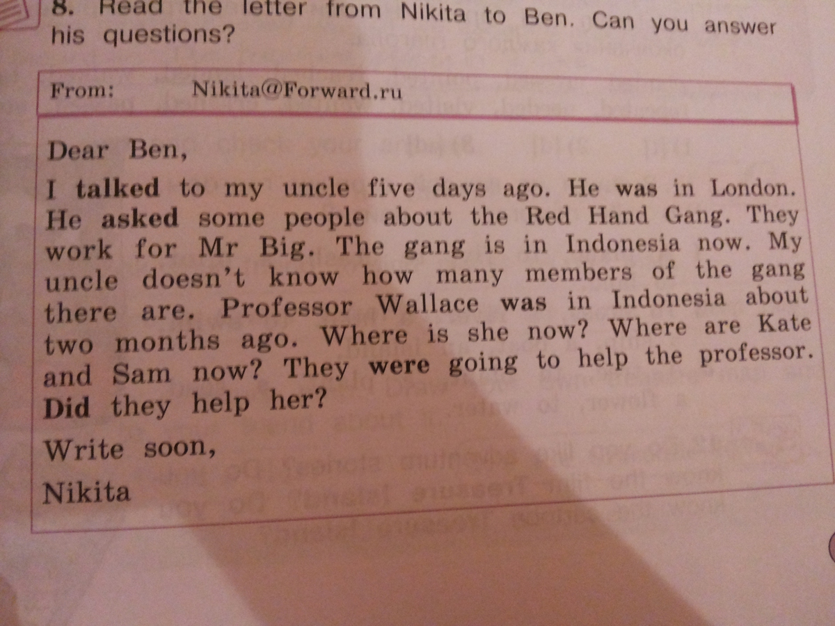 Дорогой Бен!Я разговаривал со своим дядей 5 дней назад.Он был в Лондоне.Он спросил несколько людей про Рэд Хэнд Гэнг.Они работают на мистера Бига.Эта банда сейчас в Индонезии.Мой дядя не знает сколько человек в этой банде.Профессор Вэллес была в Индонезии где-то 2 месяца назад.Где она сейчас?Где Кэйт и Сэм сейчас?Они собирались помочь профессору.Они помогли ей?