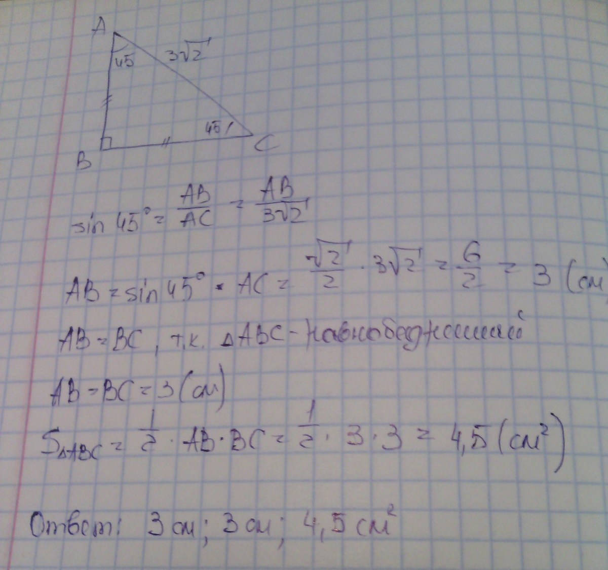 В прямоугольном треугольнике с острым углом 45 градусов гипотенуза равна 3 корень из 2 см.Найдите катеты и площадь этого треугольника.