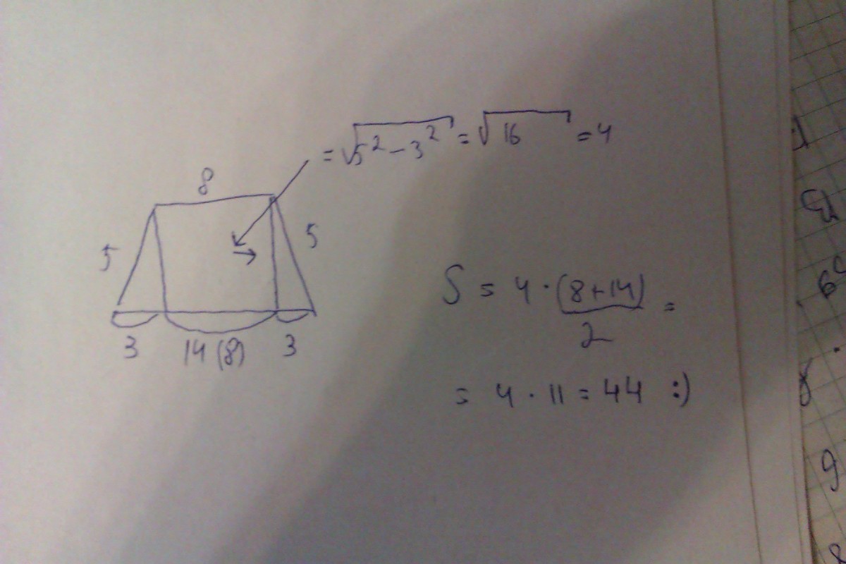 Как найти площадь равнобедренной трапеции не строя ее, со сторонами: основания- 8 и 14 см