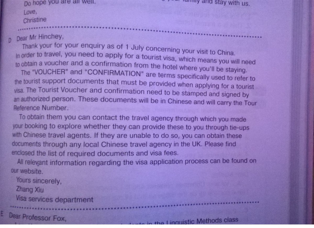 Надеюсь, вы остаетесь с нами Любовь, Кристина D Уважаемый г-н Хинчи, спасибо вашего для вашего запроса состоянию на 1 июля в отношении вашего визита в Китай. Для того, чтобы путешествовать, вы должны подать заявление на туристическую визу, которая означает, что вы должны будете получить ваучер и подтверждение от отеля, где вы будете жить. Акции "и" подтверждение "являются термины, специально используется для обозначения туристический поддержки документов, которые должны быть предоставлены при подаче заявки на получение туристической визы. Туристическая путевка и подтверждение должны быть с печатью и подписью уполномоченного лица. Эти документы будут в китайский и будет нести Reference Number Тур. Чтобы получить их, вы можете обратиться в туристическое агентство, через которое вы сделали заказ, чтобы исследовать, могут ли они представить их вам через тай-UPS с китайскими туристических агентов. Если они не в состоянии сделать это, Вы можете получить эти документы через любой местной китайской туристическое агентство в Великобритании. Вы можете найти прилагается список необходимых документов и виз. Вся информация, касающаяся процесса получения визы можно найти на нашем сайте. С уважением, Чжан Сю визового отдела услуг Уважаемый профессор Фокс, класс