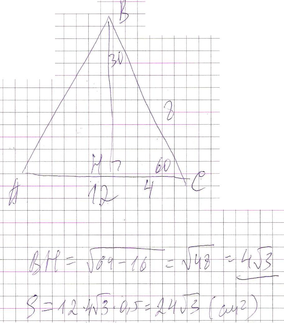 В треугольнике две стороны равны 12см и 8см, а угол между ними 60° . Найдите площадь треугольника.