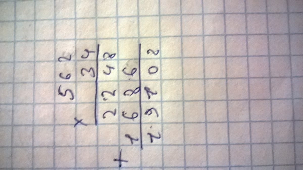 Пишешь пример с фотки, потом 4 умножаешь на каждое число из 562, если число при умножении больше 10(включительно) значит пишешь последнее, а первое запоминаешь в уме и к следующему прибавляешь.Так и с 3.