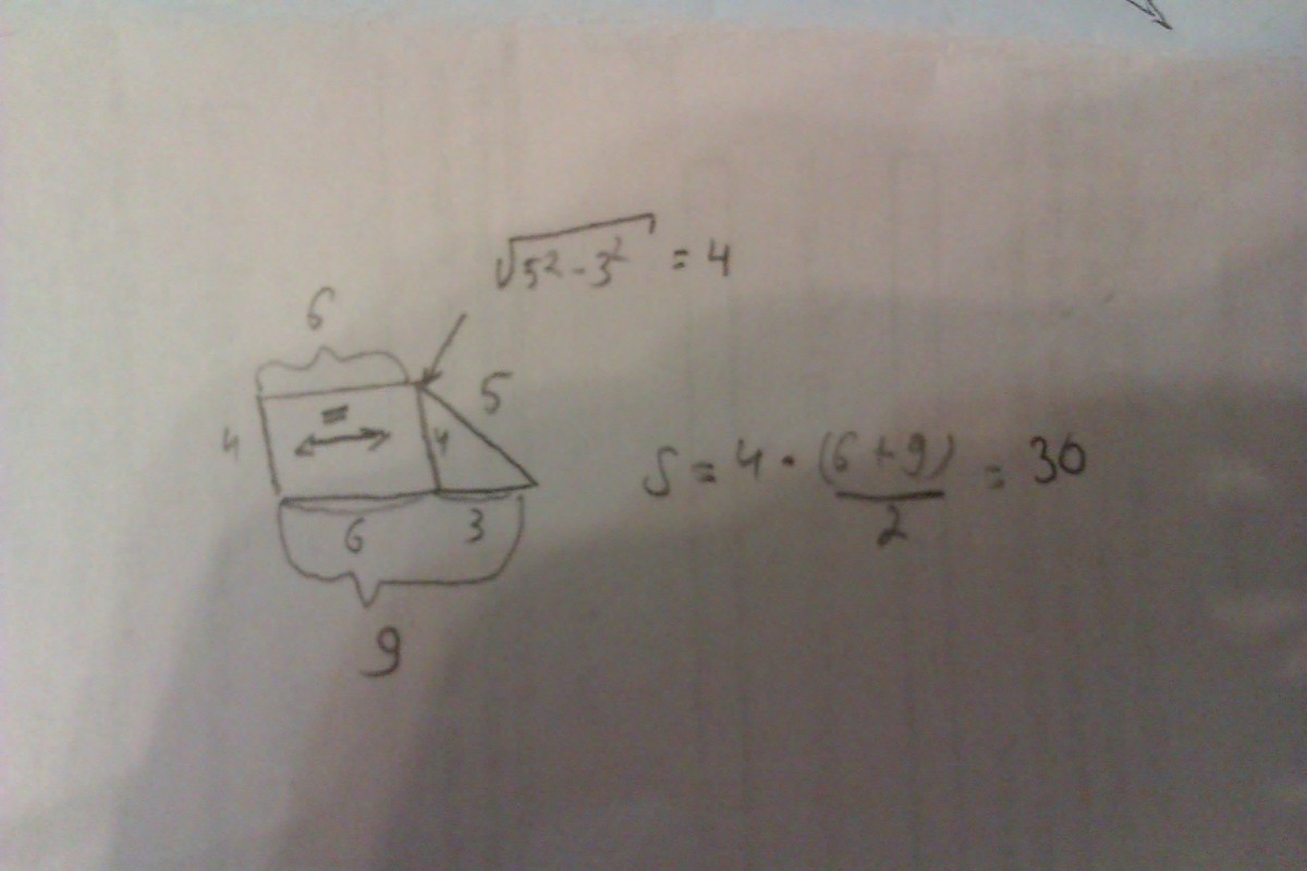 в прямоугольной трапеции основания равны 6 см и 9 см , а большая боковая сторона равна 5 см.Найдите площадь этой трапеции.