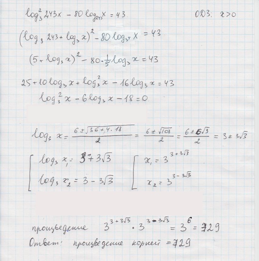 log^2 (243x) по основанию 3 - 80logx по основанию 243 =43 ( если уравгение имеет более одного корня, в ответ укажите произведение всех корней уравнения)