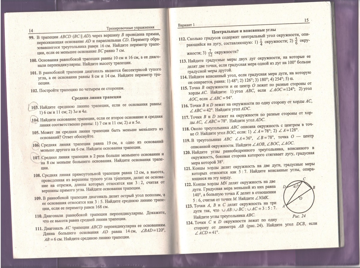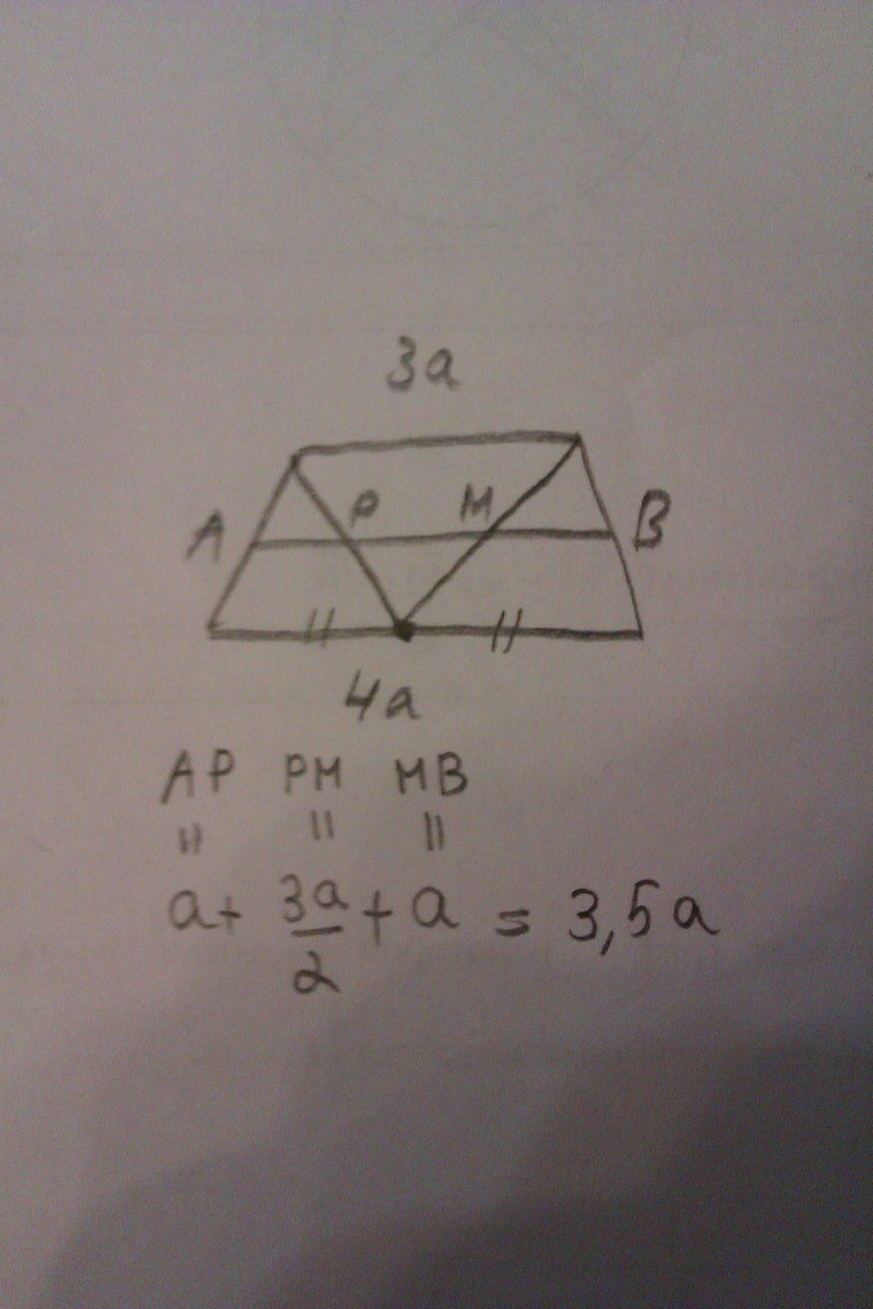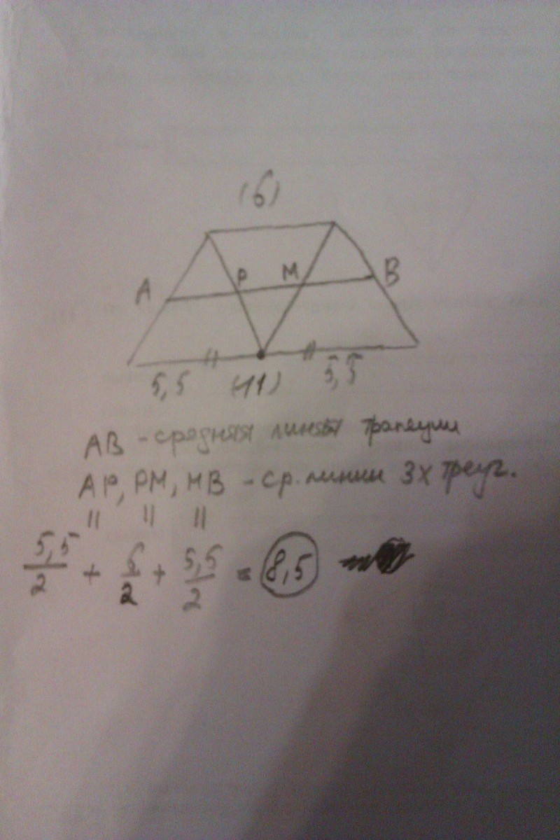 среднюю линюю трапеции можно найти по средним линиям 3х треугольников из которой она состоит. Как ты знаешь, средняя линяя треугольника (равнобедренного!) это половина основания. Первую задачу я тебе решу - остальное сама, не ленись!)