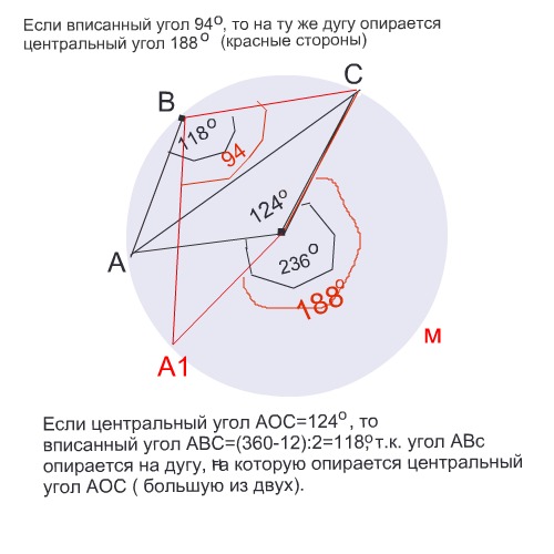 1)Вписанный угол АВС, если он и центр окружности находятся по разные стороны от хорды АС, равен половине центрального угла АОС (на рисунке через м), т.к. угол АВс опирается на дугу АмС. Он равен (360-124):2=118°