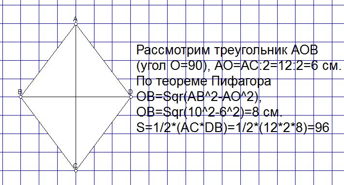 Решается по формуле одна вторая умножить на произведение диагоналей