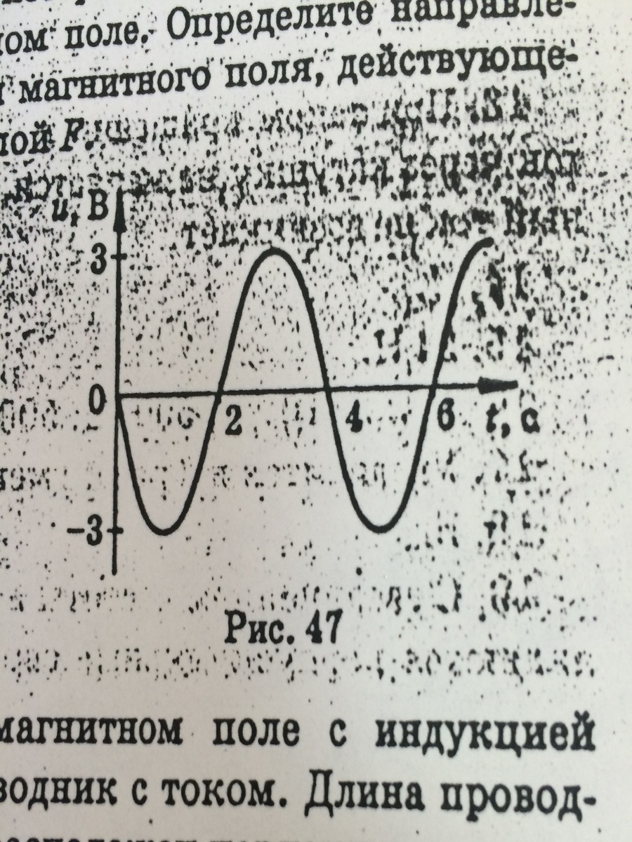 На рисунке показан график зависимости напряжения на концах катушки с током от времени. Определите амплитуду, период и частоту колебаний напряжения.