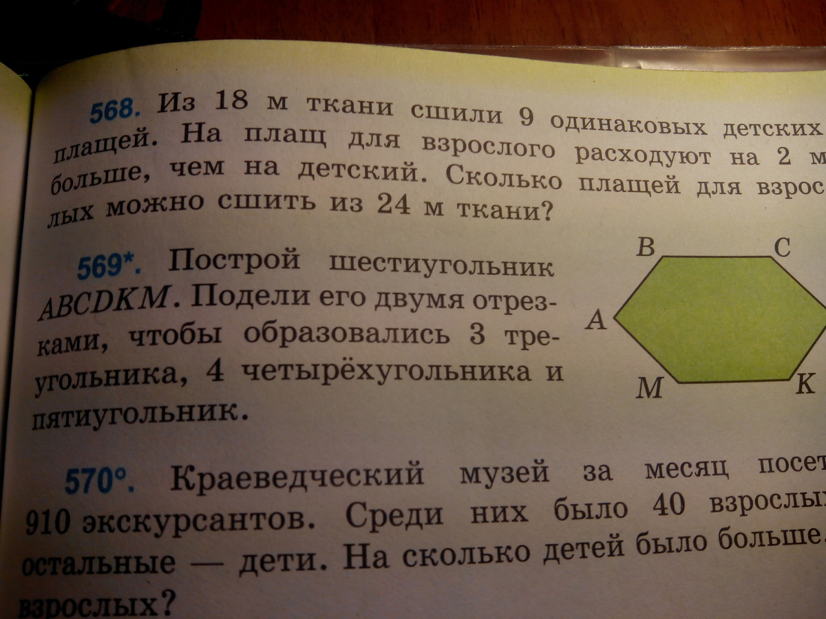 Построит шестиугольник ABCDKM. Подели его двумя отрезками, чтобы образовались 3 треугольника, 4 четырехугольника и пятиугольник.