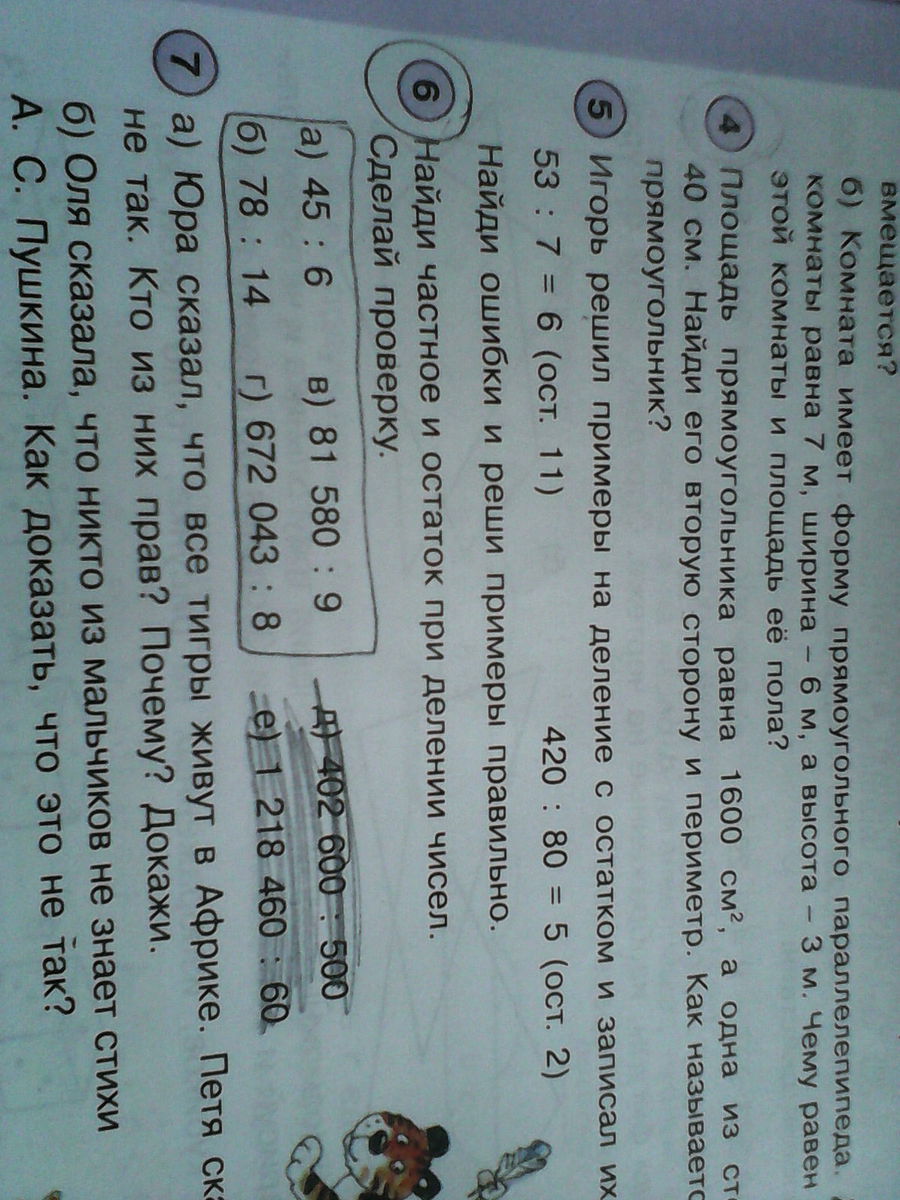 45:6=7(ост 3) 78:14=5(ост 8) 81580:9=9064(ост 4) 672043 :8= 84005(ост 3) Проверка: 1) (6 * 7) +3 45 2)(5*14)+8=78 3)(9064 * 9)+4= 81580 4)(84005 * 9)+3= 672043