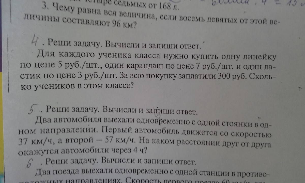 Если принять за количество учеников х и что каждому ученику раздали купленные предметы то тогда на одного ученика потратили 5+3+7=15