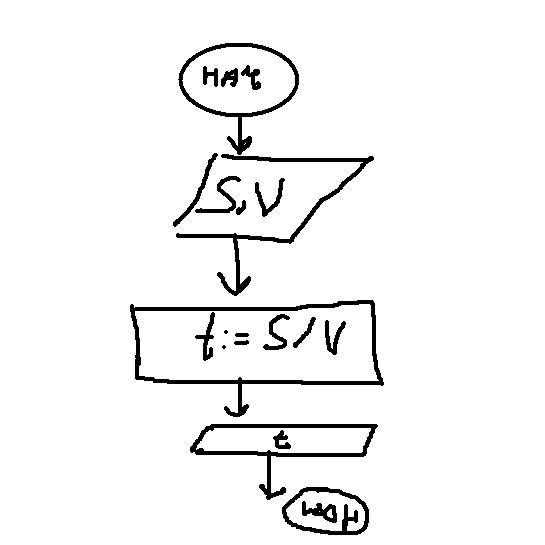 Сколько времени в минутах затратит школьник на дорогу из школы, если известна длина расстояния S в километрах и средняя скорость движения школьника V км/час? помогите решить 3 способами 1.постановка задачи 2.записи алгоритма( алгоритм решения в виде блок схемы) 3. запись алгоритма на языке программирования(паскаль)