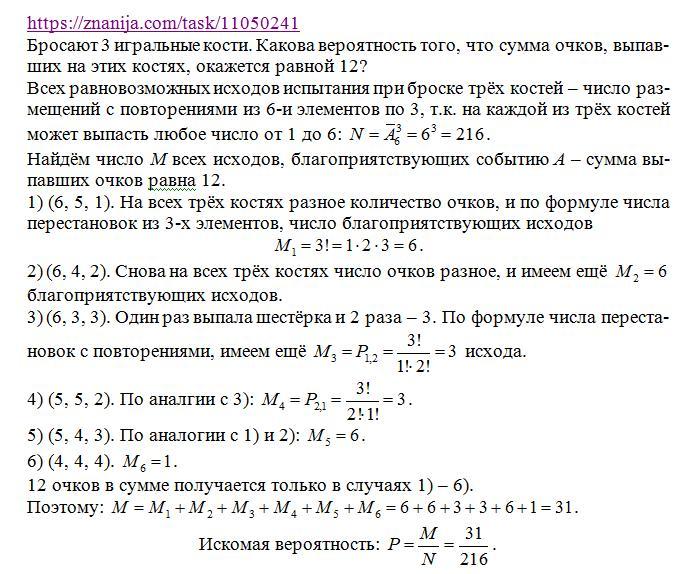 Бросают 3 игральные кости .Какова вероятность того, что сумма очков, выпавших на этих костях , оказаться равной 12