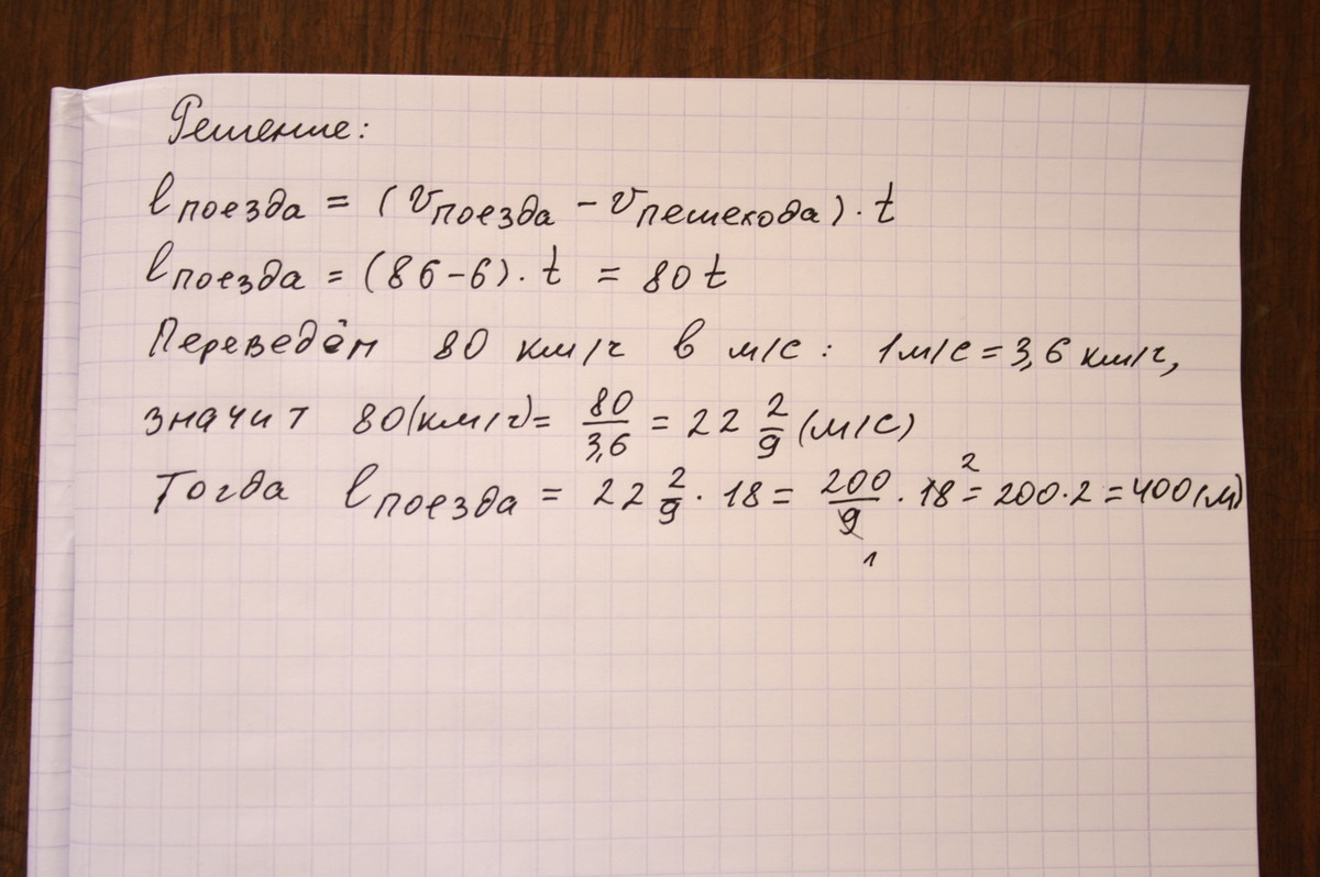 Поезд, двигаясь равномерно со скоростью 86 км/ч, проезжает мимо пешехода, идущего в том же направлении параллельно путям со скоростью 6 км/ч, за 18 секунд. Найдите длину поезда в метрах.