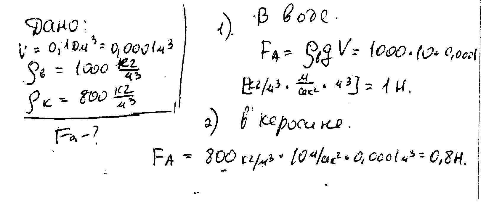 Объем куска железа 0,1 дм3. Какая выталкивающая сила будет на него действовать при полном погружении в воду? в керосин?