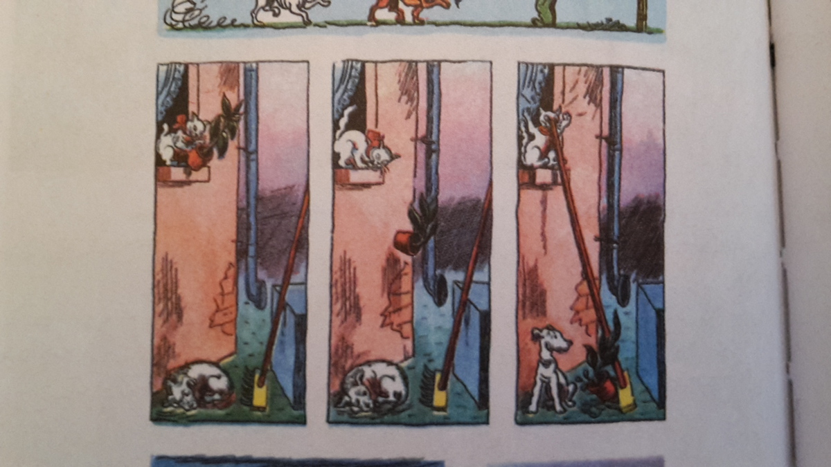 На этой картинке видно, как кошка, попала в глупую ситуации., сама, без чьей либо помощи. Не рой другому яму, сам в нее попадешь, вот что он хотел сказать этой картиной. Эта ситуация создана , в данном случае кошкой, которая сама себе и насолила. Воспитательный мотив проходит через все его творчество…Он учит людей быть добрее друг к другу, тогда мир будет намного лучше…