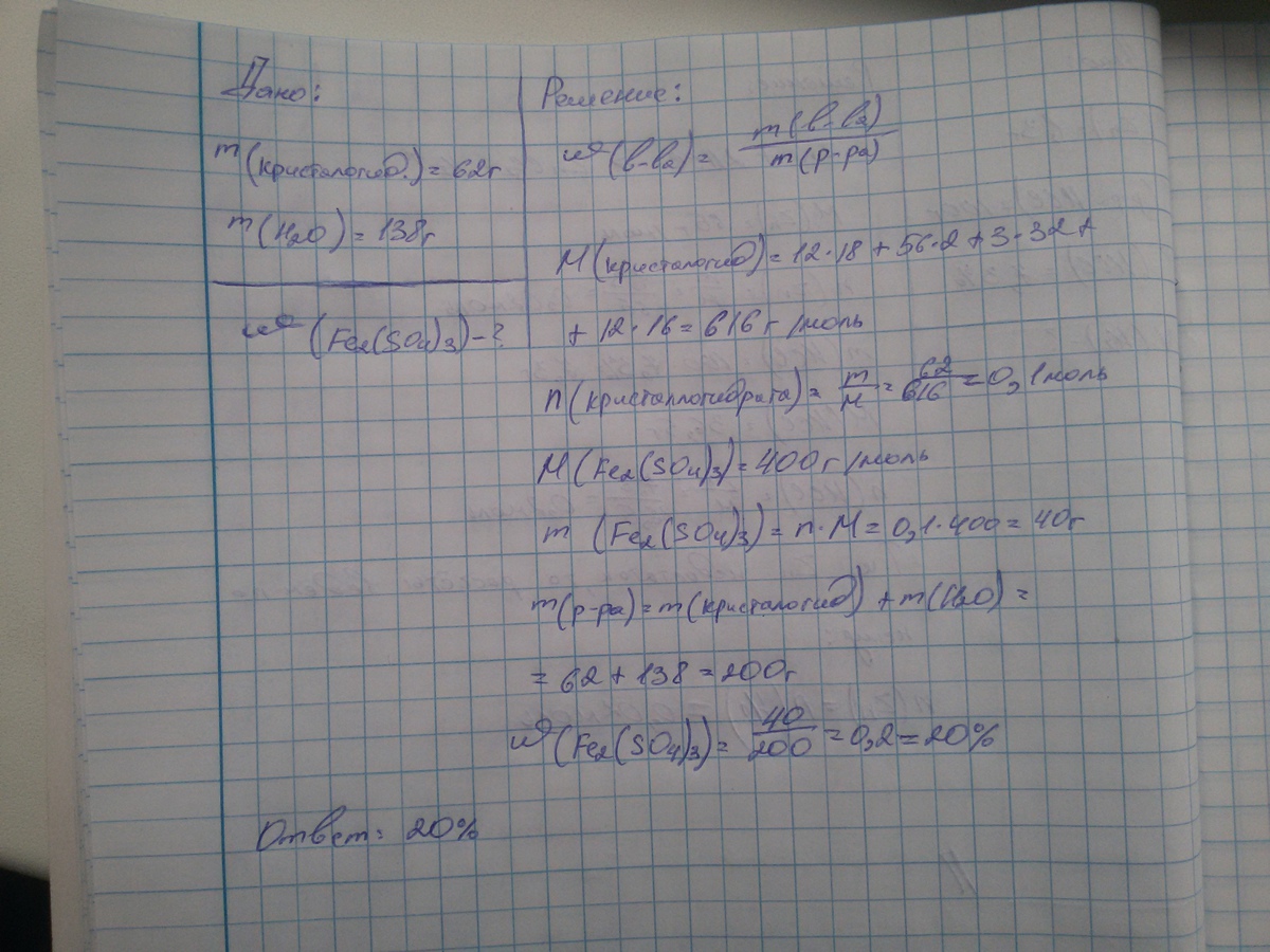 Рассчитайте массовую долю безводного сульфата железа(III) в растворе, полученном растворением кристаллогидрата Fe2(SO4)3*12H2O массой 62г в воде массой 138г