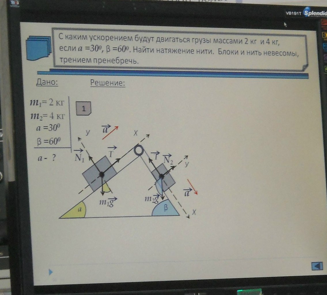 отсюда a=(m2gsinB-m1gsinA)/(m1+m2)=9,7