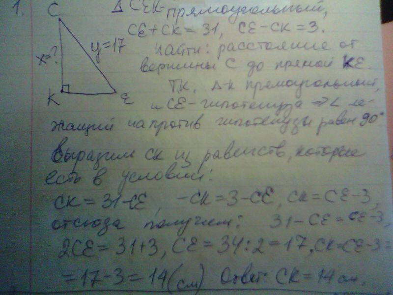 1Сумма гипотенузы СЕ и катета СК прямоугольного треугольника СКЕ равна 31 см, а их разность равна 3 см. найдите расстояние от вершины С до прямой КЕ