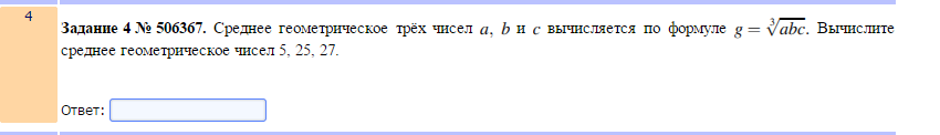 Среднее геометрическое трёх чисел и вычисляется по формуле g=∛авс Вычислите среднее геометрическое чисел 5, 25, 27.