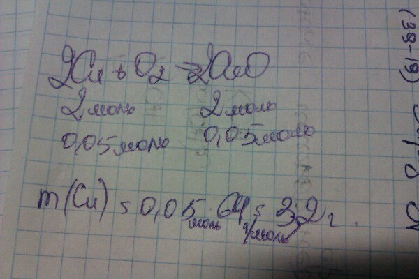 Определите массу меди (г),вступившей в реакцию с кислородом,если образовалось 0,05 моль оксида меди (2).Ответ дайте с точностью до десятых