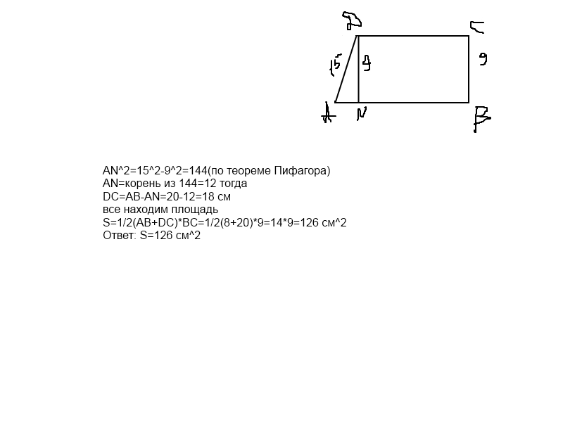 в прямоугольной трапеции боковые стороны равны 15 см и 9 см,а большее основание 20 см.найти площадь трапеции