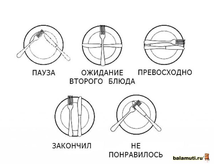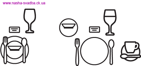 Слева: как подать гостю десертный прибор: на десертной тарелке лежат десертная вилка и десертная ложка, между ними на салфеточке и (или) маленькой тарелке стоит чаша для ополаскивания пальцев (обязательная принадлежность официального обеда и ленча).