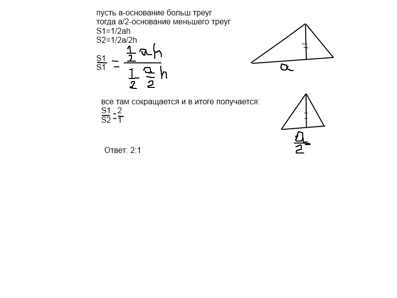 Высоты треугольников равны, а основание одного из них в 2 раза меньше другого. Найдите отношение площадей этих треугольников.
