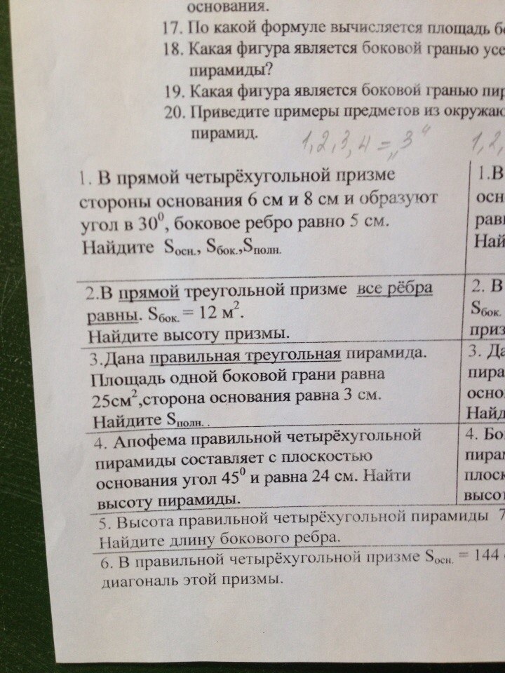 2.Так как все ребра равны,то боковые грани являются квадратами.Далее,площадь одной грани=три площади боковой поверхности,то есть 12:3=4(м^2).Значит сторона квадрата=корень из 4= 2 метра.Следовательно,ребро призмы=высоте 2 метра.Ответ 2 метра