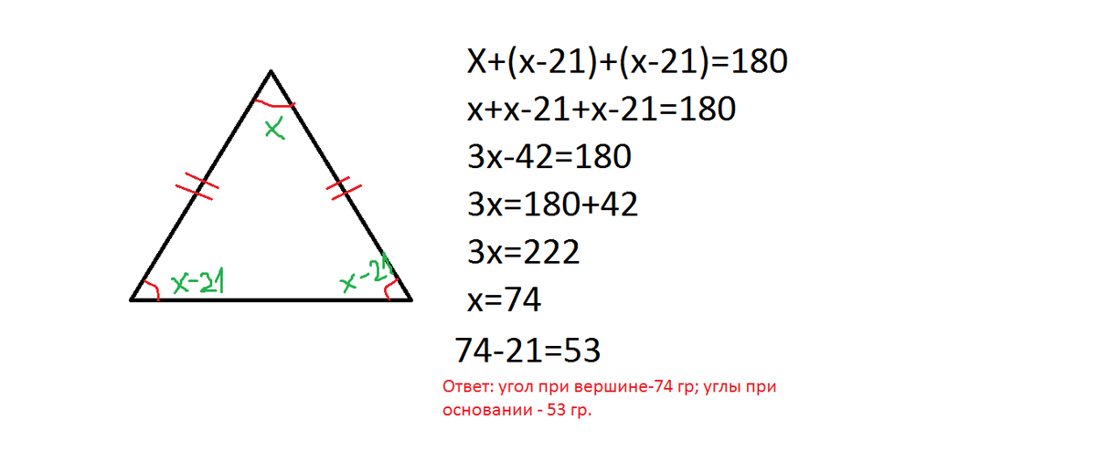 в равнобедренном треугольнике abc с основание ac угол при основании 21 градус меньше от угла привершине противоположной основе. Найдитевсе углы