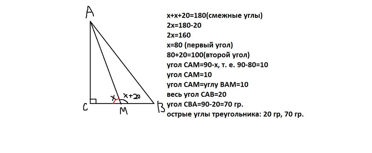 В прямоугольном треугольнике биссектриса наименьшего угла образует с меньшим катетом углы, один которых на 20 градусов больше за другой. Найдите острые углы данного треугольника