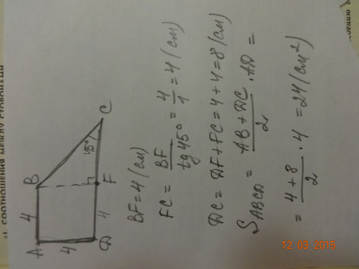 Две меньшие стороны прямоугольной трапеции равны 4 см, а один из ее углов составляет 45 градусов. Найти площадь трапеции. Помогите решить очень надо!!!!!