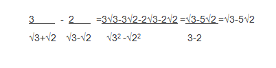 3/(√3+√2) -2/(√3-√2)=(3√3-3√2-2√3-2√2)/(3-2)=√3-5√2
